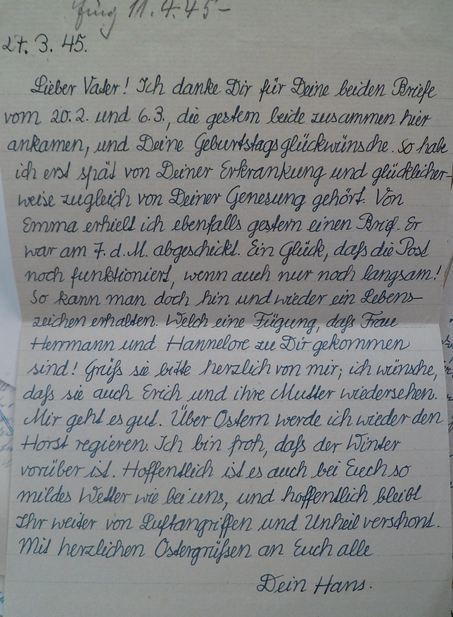Die Briefe, die Emma Lüthjes Vater Peter Heinrich bis kurz vor seinem Freitod im Eckernförder Hafen schrieb, wie diesen am 21.3.1945 an einen Otto, sind schwer zu entziffern. Er beendete sie meist mit einem "Heil Hitler", auch wenn seine Briefpartner ihn meist nur "herzlich grüßten". Im Weiteren findet sich weitere noch nicht ausgewertete Korrespondenz des einstigen Kleinbahndirektors.